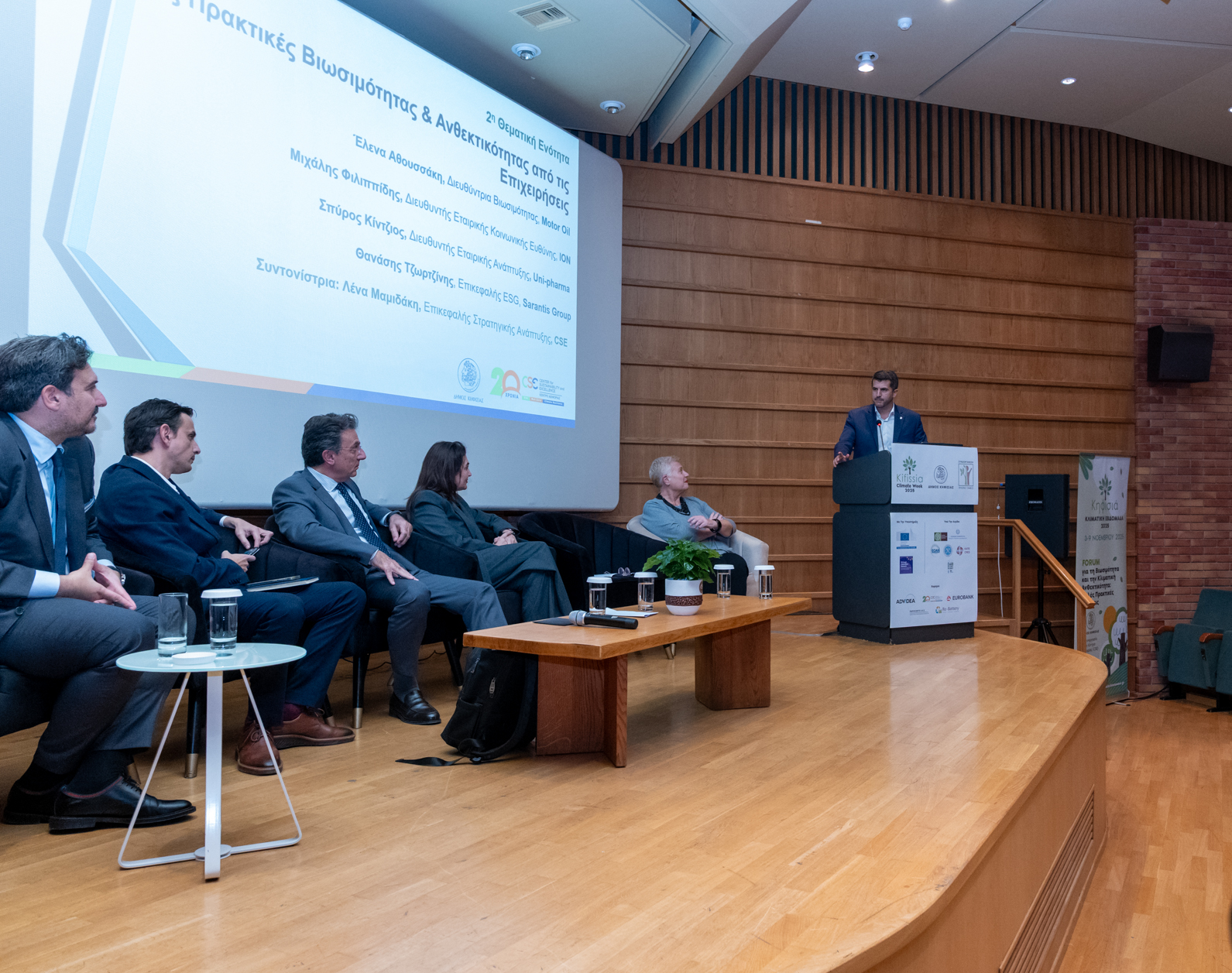 Στη 2η Θεματική Ενότητα με τίτλο «Καλές Πρακτικές Βιωσιμότητας & Ανθεκτικότητας από τις Επιχειρήσεις» στελέχη επιχειρήσεων παρουσίασαν τις δικές τους δράσεις για την πράσινη μετάβαση και κλιματική ανθεκτικότητα. Στη συζήτηση που συντόνισε η Λένα Μαμιδάκη, Head of Strategic Development στο CSE συμμετείχαν η Έλενα Αθουσάκη (Διευθύντρια Βιωσιμότητας της Motor Oil), ο Σπύρος Κίντζιος (Διευθυντής Εταιρικής Ανάπτυξης Uni-pharma), Θανάσης Τζωρτζίνης Επικεφαλής ESG, Sarantis Group και ο Μιχάλης Φιλιππίδης (Διευθυντής ΕΚΕ της ΙΟΝ).
