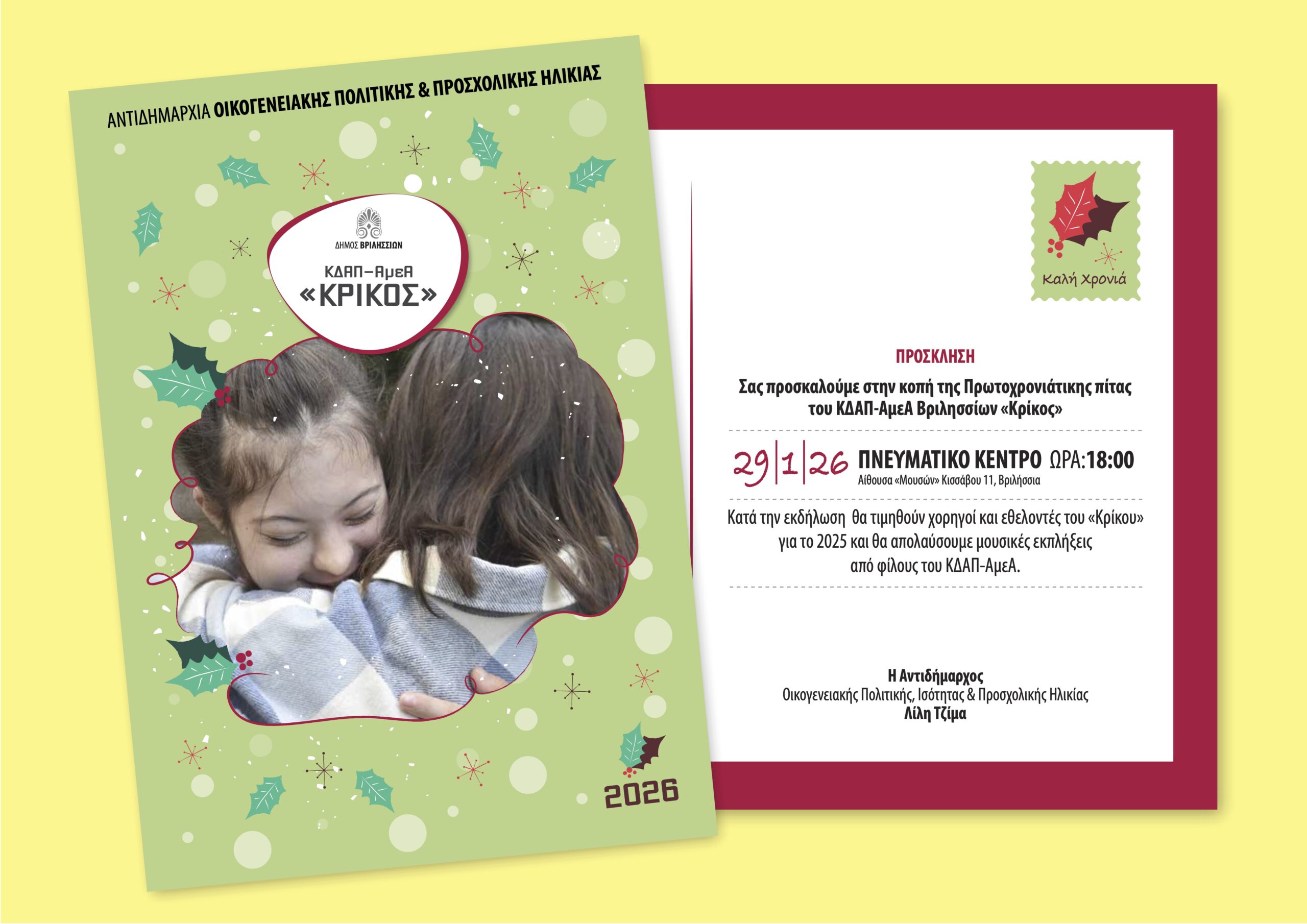 Το ΚΔΑΠ ΑμεΑ «Κρίκος» του Δήμου Βριλησσίων έχει την τιμή να προσκαλέσει όλους τους φίλους, συνεργάτες και φορείς της πόλης μας στην εκδήλωση κοπής της Πρωτοχρονιάτικης Πίτας του.