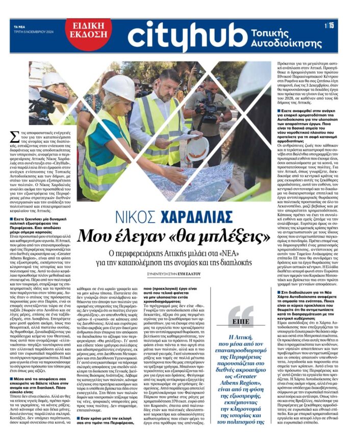 Συνέντευξη του Περιφερειάρχη Αττικής στο ένθετο για την τοπική αυτοδιοίκηση “City Hub” της εφημερίδας «Τα Νέα» και στη δημοσιογράφο Εύη Σαλτού