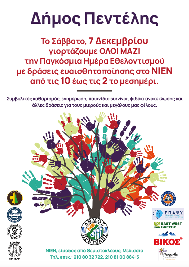 Σας προσκαλούμε να γιορτάσουμε όλοι μαζί υπό την αιγίδα του Δήμου Πεντέλης την Παγκόσμια Ημέρα Εθελοντισμού το Σάββατο 7 Δεκεμβρίου 2024 στις 10:00 στο ΝΙΕΝ (πρώην Νοσηλευτικό Ίδρυμα Εμπορικού Ναυτικού)
