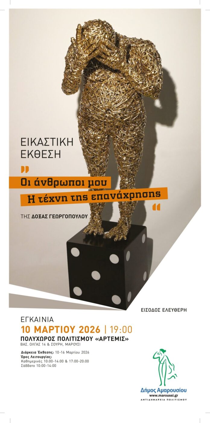 Ο Δήμαρχος Αμαρουσίου Θεόδωρος Αμπατζόγλου και η Αντιδήμαρχος Πολιτισμού Ειρήνη-Μαρία Χαλιώτη, σας προσκαλούν στα εγκαίνια της Εικαστικής Έκθεσης «Οι άνθρωποι μου – Η τέχνη της επανάχρησης» της Δόξας Γεωργοπούλου, την Τρίτη 10 Μαρτίου 2026 ώρα 19:00, στον Πολυχώρο Πολιτισμού «ΑΡΤΕΜΙΣ» (Βασ. Όλγας 14 & Σουρή, Μαρούσι).