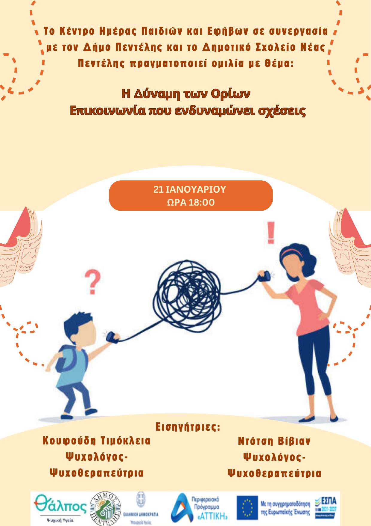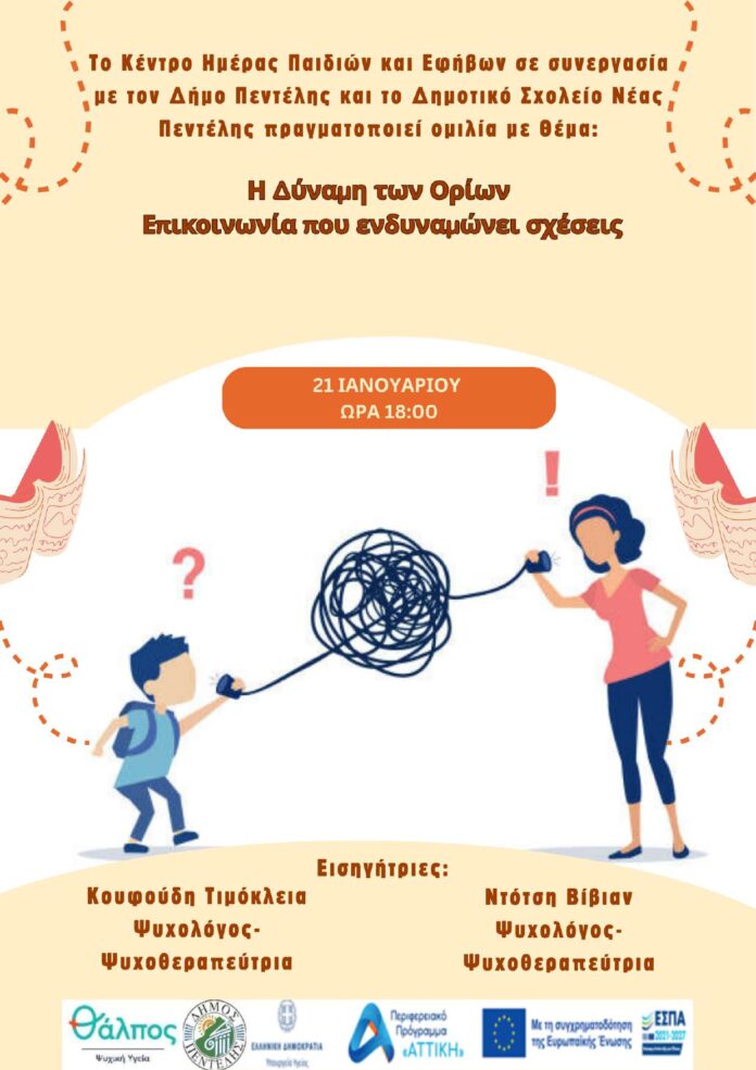 Το Κέντρο Ημέρας Παιδιών και Εφήβων ΘΑΛΠΟΣ, σε συνεργασία με τον Δήμο Πεντέλης και το 4ο Δημοτικό Σχολείο Μελισσίων πραγματοποιεί ομιλία με θέμα: