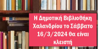 Δημοτική Βιβλιοθήκη Χαλανδρίου – Θα είναι κλειστή το Σάββατο 16/3/2024