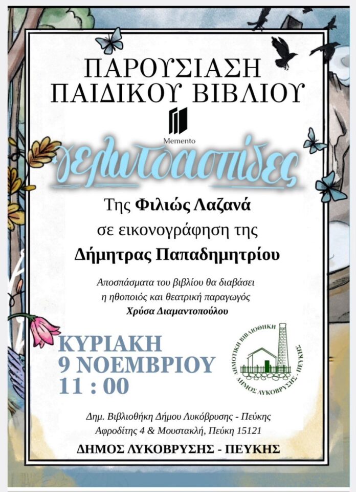 Την Κυριακή, 9 Νοεμβρίου, ώρα 11:00, οι Εκδόσεις Memento παρουσιάζουν το παιδικό βιβλίο με τίτλο «Γελωτοασπίδες», στη Δημοτική Βιβλιοθήκη του Δήμου Λυκόβρυσης-Πεύκης (Αφροδίτης 4 & Μουστακλή, στην Πεύκη).