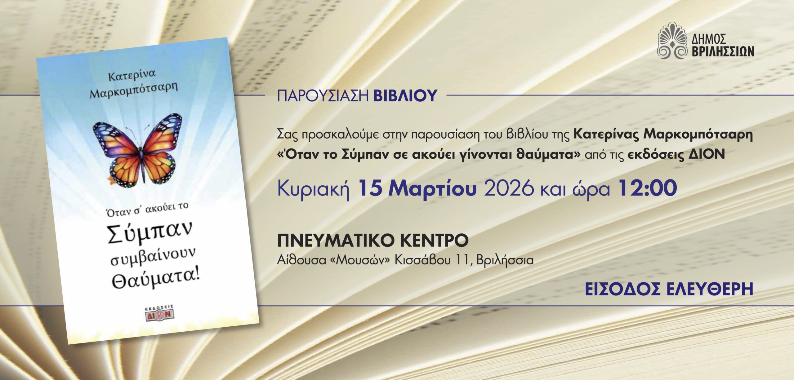 Το βιβλίο της Κατερίνας Μαρκομπότσαρη με τίτλο «Όταν το Σύμπαν σε ακούει γίνονται θαύματα», που κυκλοφορεί από τις Εκδόσεις ΔΙΟΝ παρουσιάζεται την Κυριακή 15 Μαρτίου 2026 και ώρα 12:00, στο Πνευματικό Κέντρο Βριλησσίων, στην αίθουσα «Μουσών» (Κισσάβου 11) στα Βριλήσσια.