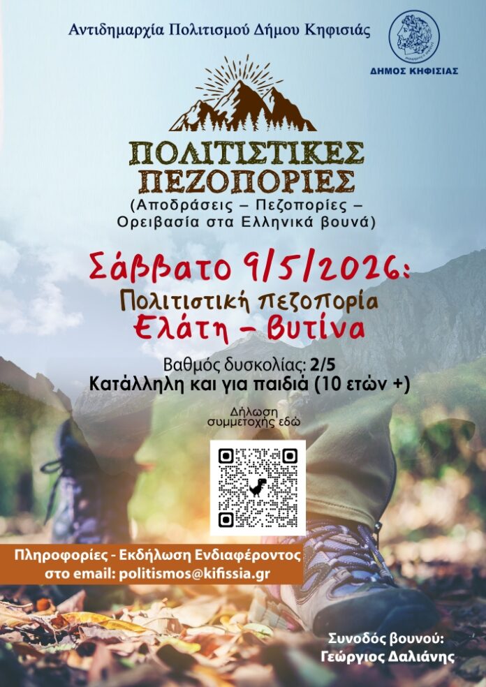 Ο Δήμος Κηφισιάς, στο πλαίσιο του φετινού προγράμματος- πεζοπορίας της Αντιδημαρχίας Πολιτισμού, συνεχίζει δυναμικά τις μοναδικές αποδράσεις Φύσης, Πολιτισμού και Ιστορίας. Συγκεκριμένα ο Σάββατο 9/5 ανακαλύπτουμε τη διαδρομή Ελάτη – Βυτίνα, ένα από τα ομορφότερα τμήματα του Menalon Trail. Από τη σκιά των ελάτων μέχρι τις όχθες του ποταμού Μυλάοντα και την ιστορική Βυτίνα, η φύση της Γορτυνίας μας περιμένει.
