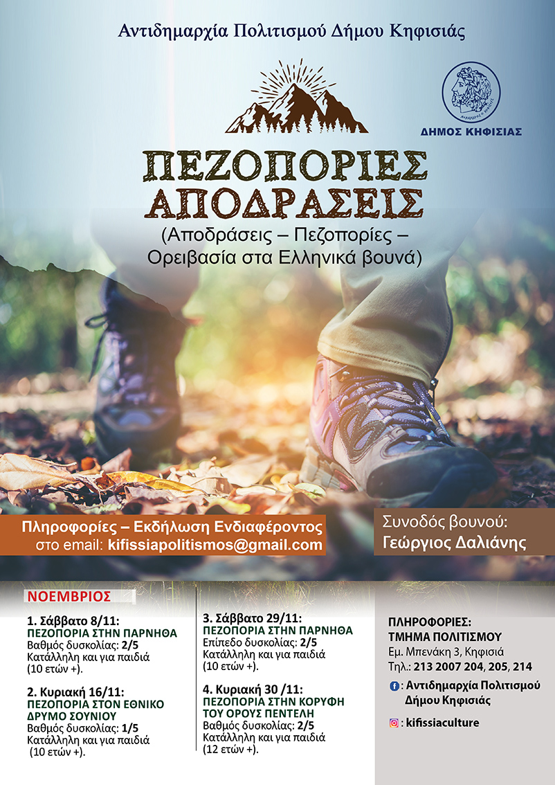 Ο Δήμος Κηφισιάς, στο πλαίσιο του φετινού προγράμματος- αποδράσεων της Αντιδημαρχίας Πολιτισμού, σας προσκαλεί το Σάββατο 29/11 σε μια ξεχωριστή πεζοπορική εμπειρία στον Εθνικό Δρυμό της Πάρνηθας, προσφέροντάς σας μια ημέρα γεμάτη από μοναδικές εικόνες και φυσική ομορφιά. Ελάτε να γνωρίσετε την Πάρνηθα μέσα από μια ενδιαφέρουσα κυκλική διαδρομή που θα ξεκινήσει και θα ολοκληρωθεί στο Καταφύγιο Μπάφι.