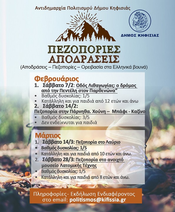 Για την ενημέρωσή σας δείτε αναλυτικά το πρόγραμμα πεζοποριών – αποδράσεων που δημιούργησε η Αντιδημαρχία Πολιτισμού του Δήμου Κηφισιάς για εσάς, για τους μήνες Φεβρουάριο και Μάρτιο 2026.