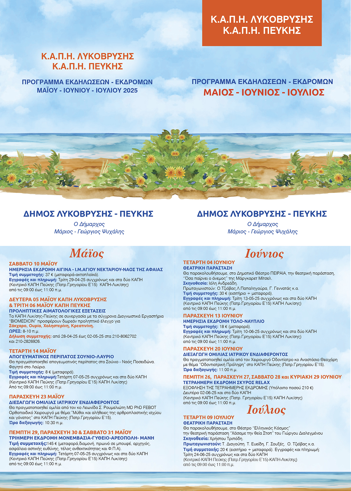 Ο Δήμος Λυκόβρυσης – Πεύκης συνεχίζει με συνέπεια και φροντίδα τη στήριξη της Τρίτης Ηλικίας, προσφέροντας στα μέλη των Κ.Α.Π.Η. ένα πλούσιο και ανανεωμένο πρόγραμμα δράσεων, εκδρομών και εκδηλώσεων για την περίοδο Μάϊου – Ιούνιου – Ιούλιου 2025.