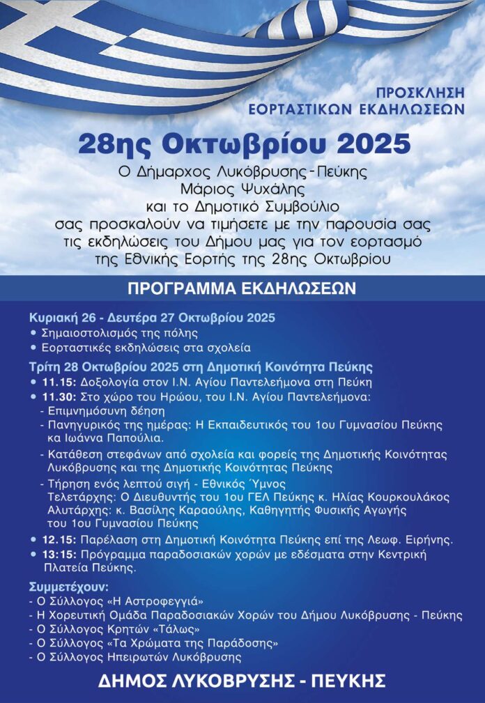 Ως Δήμος Λυκόβρυσης-Πεύκης, σας καλούμε όλους και όλες, να συμμετάσχετε ενεργά στις φετινές εορταστικές και τιμητικές εκδηλώσεις. Ας αποτίσουμε τον οφειλόμενο φόρο τιμής στους ήρωες και τις ηρωίδες που αγωνίστηκαν και θυσιάστηκαν για να μπορούμε εμείς σήμερα να ζούμε ελεύθεροι.