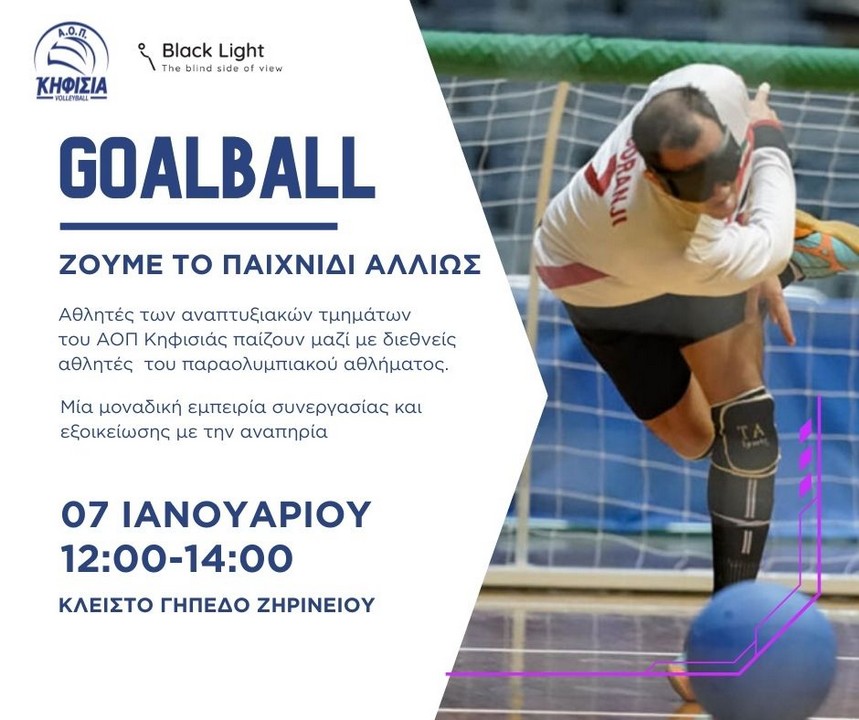 Την Τετάρτη 7 Ιανουαρίου, από τις 12.00 – 14.00, στο Κλειστό Γήπεδο Ζηρινείου αθλητές των αναπτυξιακών τμημάτων του Α.Ο.Π. Κηφισιάς θα παίξουν μαζί με διεθνείς αθλητές του παραολυμπιακού αθλήματος, αποκλειστικά για τυφλά άτομα, είτε με μερική απώλεια όρασης.