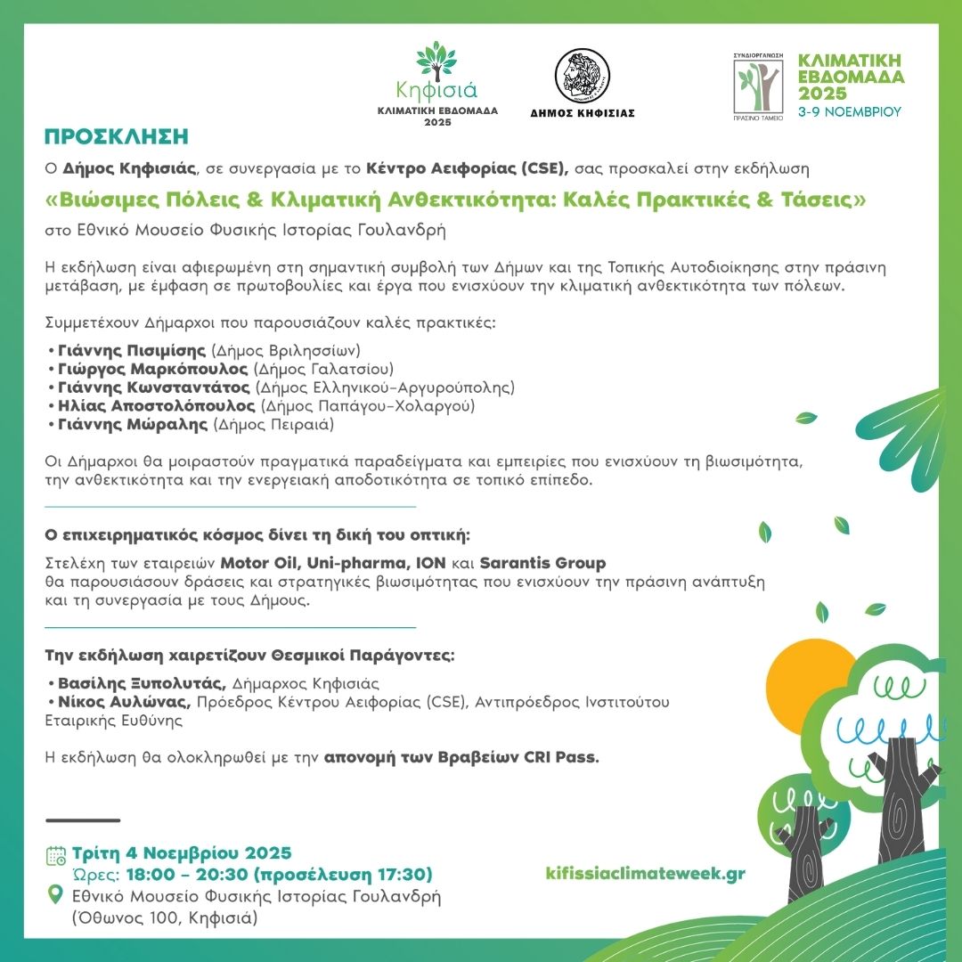 Ο Δήμος Κηφισιάς, σε συνεργασία με το Κέντρο Αειφορίας (CSE), σας προσκαλεί στο Forum Βιωσιμότητα και Κλιματική Ανθεκτικότητα: Καλές Πρακτικές & Τάσεις, που θα πραγματοποιηθεί την Τρίτη 4 Νοεμβρίου 2025, στις 17.30 στο Εθνικό Μουσείο Φυσικής Ιστορίας Γουλανδρή (Όθωνος 100, Κηφισιά), στο πλαίσιο της διοργάνωσης Κλιματική Εβδομάδας Κηφισιάς 2025 (3-9/11).