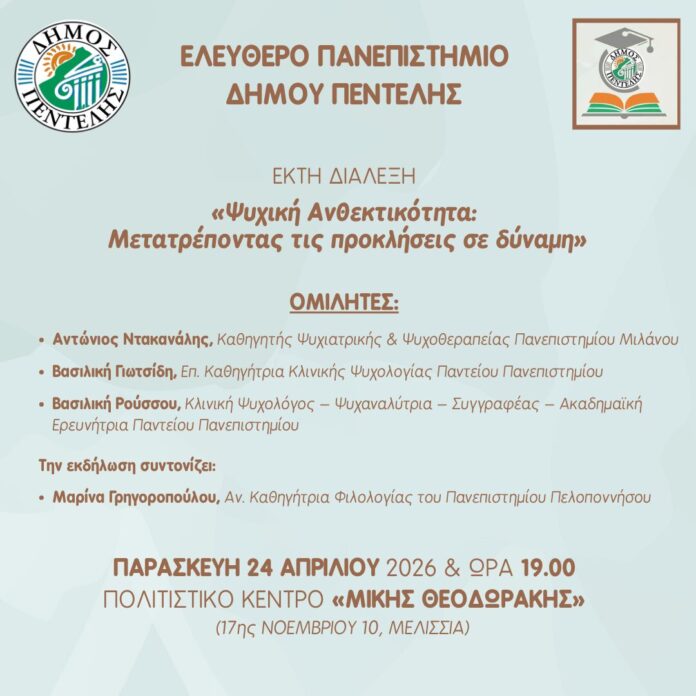 Το Ελεύθερο Πανεπιστήμιο του Δήμου Πεντέλης αφιερώνει την 6η εκδήλωσή του για το ακαδημαϊκό έτος 2025–2026 στη σημασία της ψυχικής ανθεκτικότητας σε έναν κόσμο που μεταβάλλεται διαρκώς.