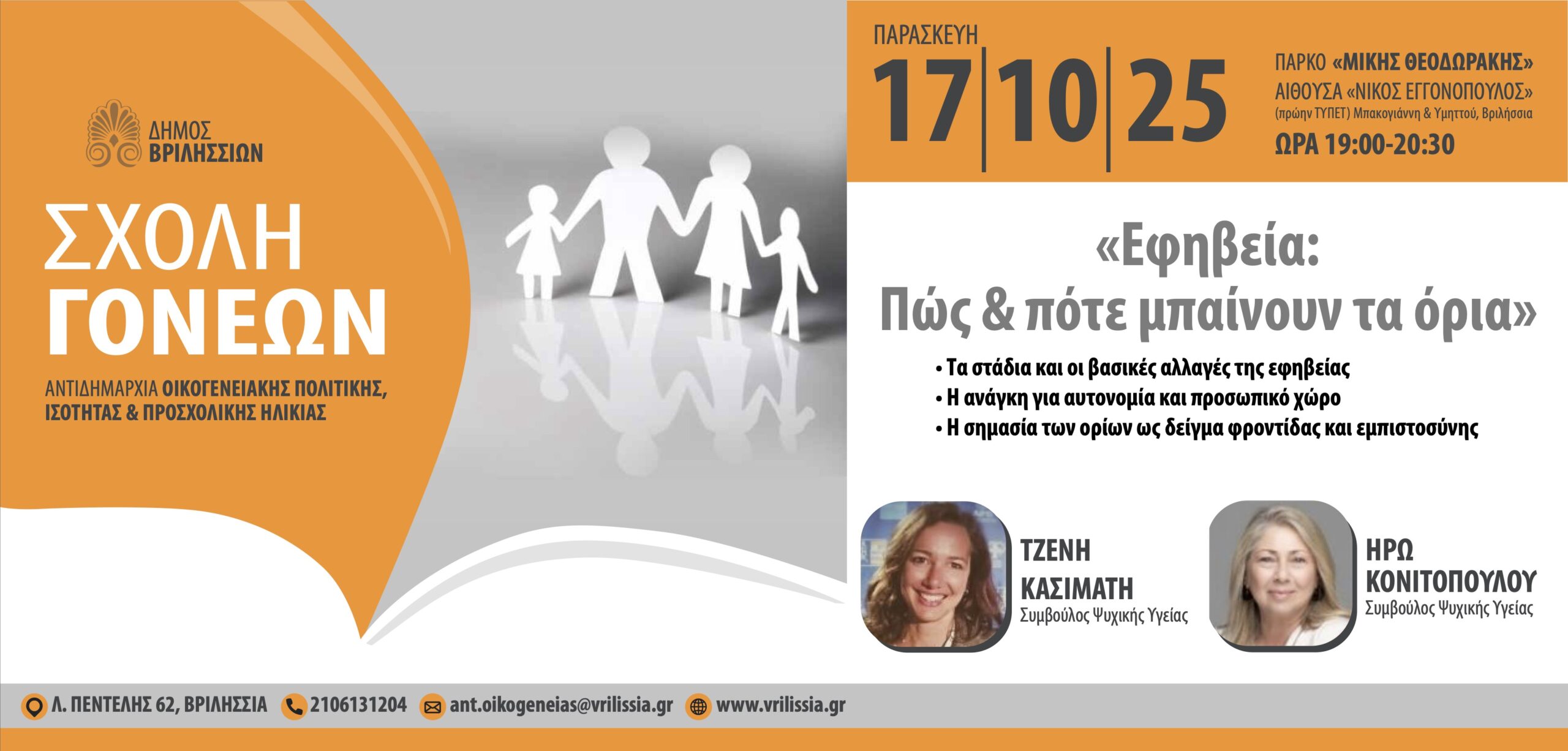 Αφιερωμένη στην εφηβεία και τα όρια είναι η συνάντηση της Σχολής Γονέων της Αντιδημαρχίας Οικογενειακής Πολιτικής Ισότητας και Προσχολικής Ηλικίας του Δήμου Βριλησσίων που θα πραγματοποιηθεί την Παρασκεύη 17/10/2025 στις 19:00 στην αίθουσα «Νίκος Εγγονόπουλος» στο πάρκο Μίκης Θεοδωράκης (πρ. ΤΥΠΕΤ) Π. Μπακογιάννη 38-42.