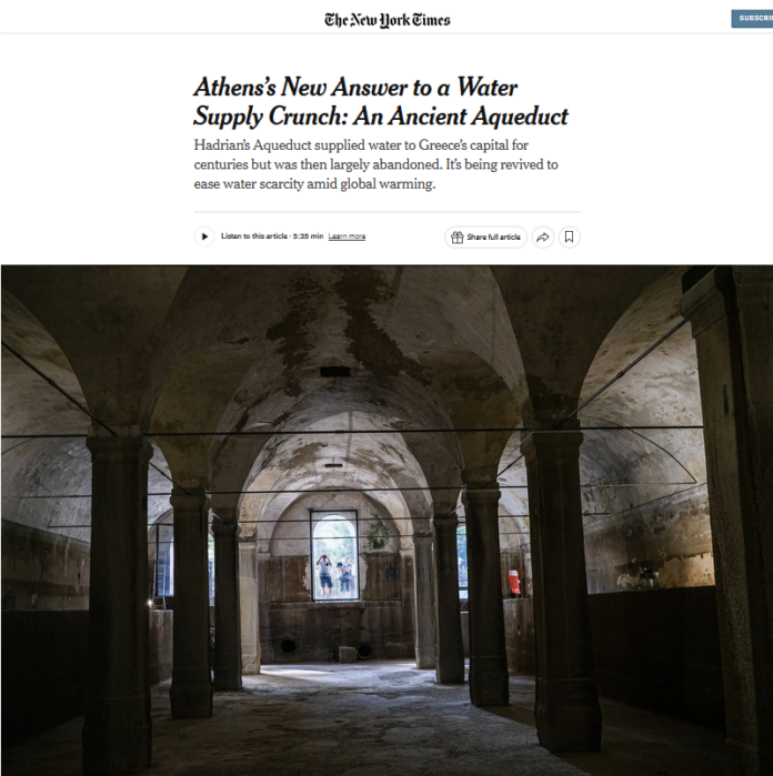 Στο ρεπορτάζ με τίτλο: «Η νέα απάντηση της Αθήνας στη λειψυδρία: ένα αρχαίο υδραγωγείο», παρουσιάζεται ως εξαιρετικά ελπιδοφόρα για την Αττική η προοπτική αξιοποίησης του νερού του Αδριάνειου Υδραγωγείου – όπως γίνεται ήδη πιλοτικά στο Χαλάνδρι- σε περιβάλλον παρατεταμένης λειψυδρίας, ως αποτέλεσμα της κλιματικής αλλαγής.