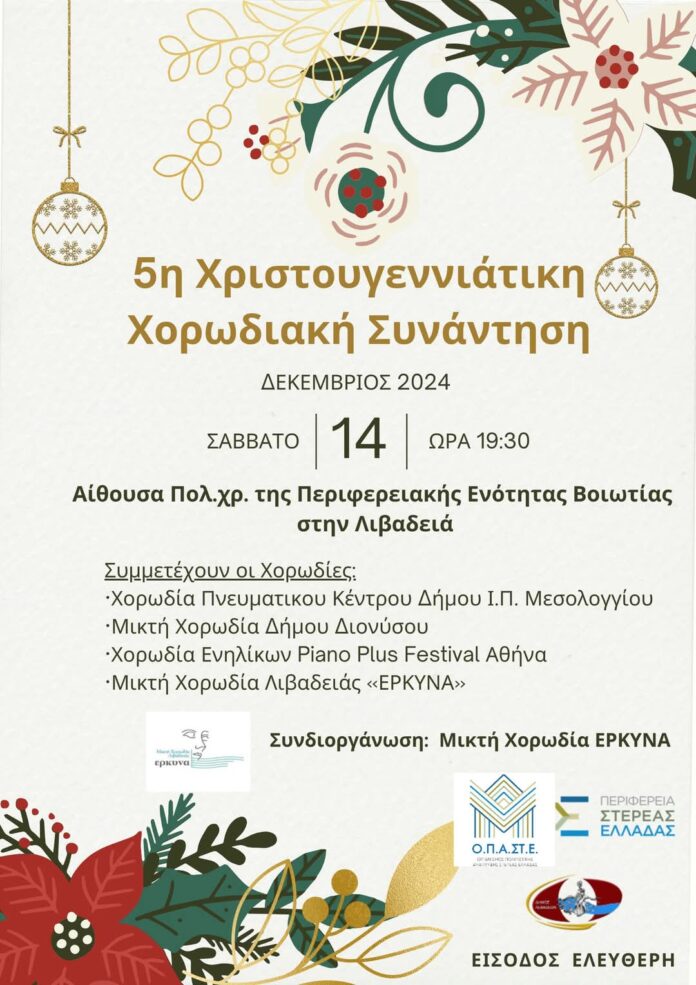 Η Μικτή Χορωδία Δήμου Διονύσου συμμετέχει στην 5η Χριστουγεννιάτικη Χορωδιακή Συνάντηση, που διοργανώνει η Μικτή Χορωδία ΕΡΚΥΝΑ Λιβαδειάς, το Σάββατο 14 Δεκεμβρίου 2024 και ώρα 19:30, στην αίθουσα πολλαπλών χρήσεων της Περιφερειακής Ενότητας Βοιωτίας στη Λιβαδειά. (Φίλωνος 35-39)…