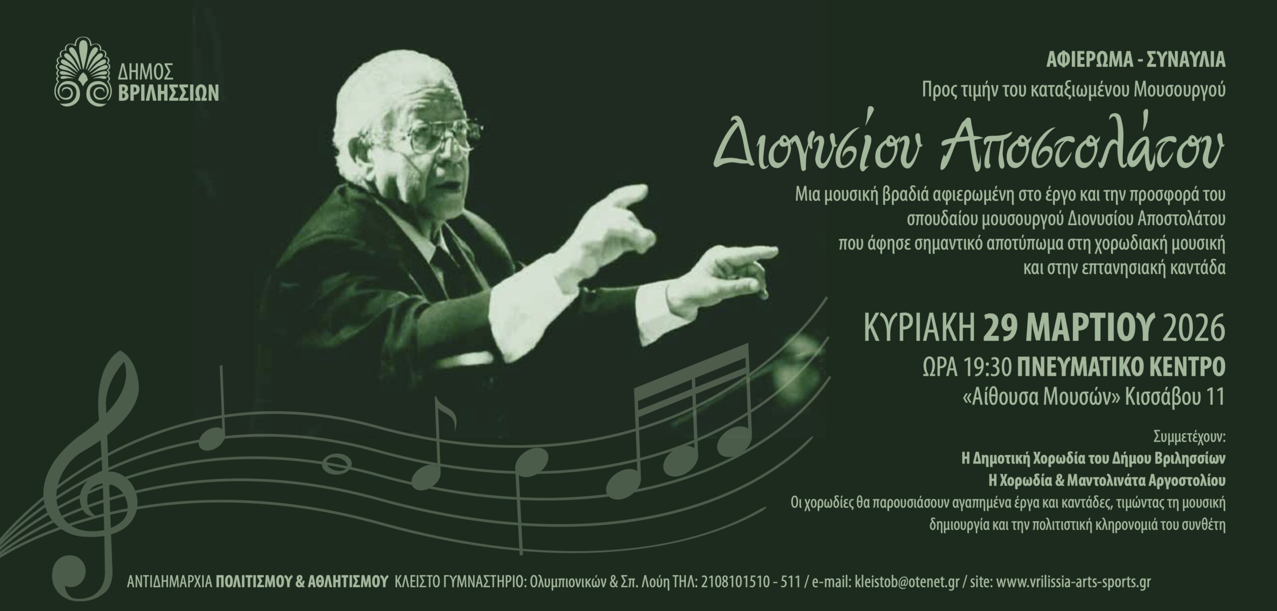 Μια μουσική βραδιά αφιερωμένη στον διακεκριμένο μουσουργό Διονύσιο Αποστολάτο διοργανώνει ο Δήμος Βριλησσίων, τιμώντας τη σημαντική προσφορά του στη χορωδιακή μουσική και την επτανησιακή καντάδα.