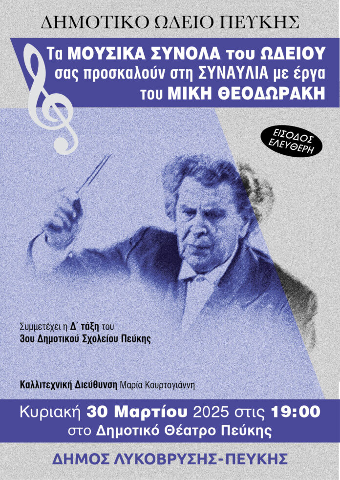 Ο Δήμος Λυκόβρυσης-Πεύκης και το Δημοτικό Ωδείο Πεύκης προσκαλούν το κοινό σε μια ξεχωριστή συναυλία αφιερωμένη στον Μίκη Θεοδωράκη, την Κυριακή 30 Μαρτίου 2025 στις 19:00, στο Δημοτικό Θέατρο Πεύκης.