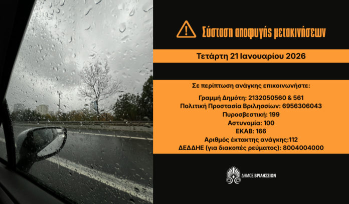 Αρχική ΓΕΙΤΟΝΙΚΟΙ ΔΗΜΟΙ ΒΡΙΛΗΣΣΙΑ Σύσταση αποφυγής μετακινήσεων για σήμερα Τετάρτη 21/01