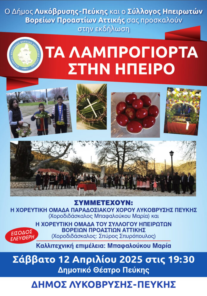 Η εκδήλωση «Τα Λαμπρογιορτά στην Ήπειρο» θα πραγματοποιηθεί το Σάββατο 12 Απριλίου 2025 και ώρα 19:30, στο Δημοτικό Θέατρο Πεύκης, με ελεύθερη είσοδο για το κοινό.