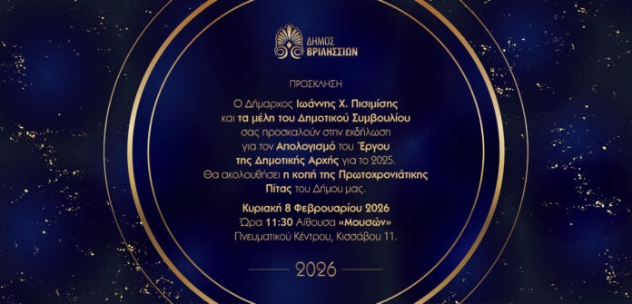 Ο Δήμος Βριλησσίων σας προσκαλεί στην εκδήλωση για τον Απολογισμό του Έργου της Δημοτικής Αρχής για το έτος 2025, η οποία θα πραγματοποιηθεί την Κυριακή 8 Φεβρουαρίου 2026 και ώρα 11:30 π.μ., στην Αίθουσα «Μουσών» του Πνευματικού Κέντρου του Δήμου Βριλησσίων (Κισσάβου 11).
