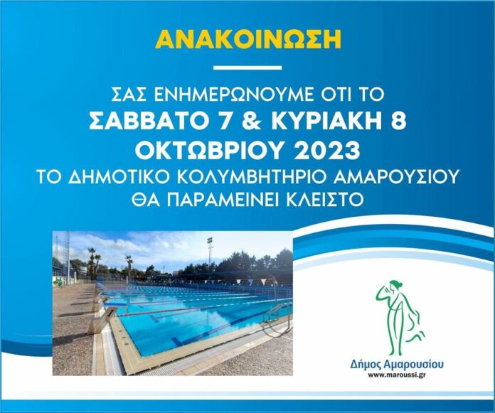 Το Δημοτικό Κολυμβητήριο Αμαρουσίου θα παραμείνει κλειστό το Σάββατο, 7 Οκτωβρίου και Κυριακή, 8 Οκτωβρίου 2023 λόγω δημοτικών και περιφερειακών εκλογών.