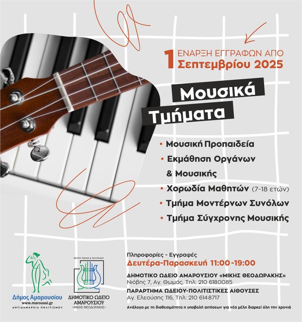 Ο Δήμαρχος Αμαρουσίου Θεόδωρος Αμπατζόγλου και ο Αντιδήμαρχος Πολιτισμού Νικόλαος Πέππας προσκαλούν όλους όσοι ενδιαφέρονται να συμμετέχουν στα Τμήματα που προσφέρει το Δημοτικό Ωδείο Αμαρουσίου «Μίκης Θεοδωράκης» το οποίο παρέχει διαβαθμισμένες σπουδές και επίσημα αναγνωρισμένα διπλώματα από το κράτος και λειτουργεί σύμφωνα με το επίσημο πρόγραμμα σπουδών του Υπουργείου Πολιτισμού.