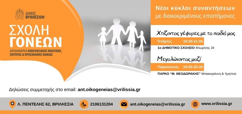 Νέοι κύκλοι συναντήσεων για τη Σχολή Γονέων του Δήμου Βριλησσίων με τη συμμετοχή διακεκριμένων επιστημόνων.